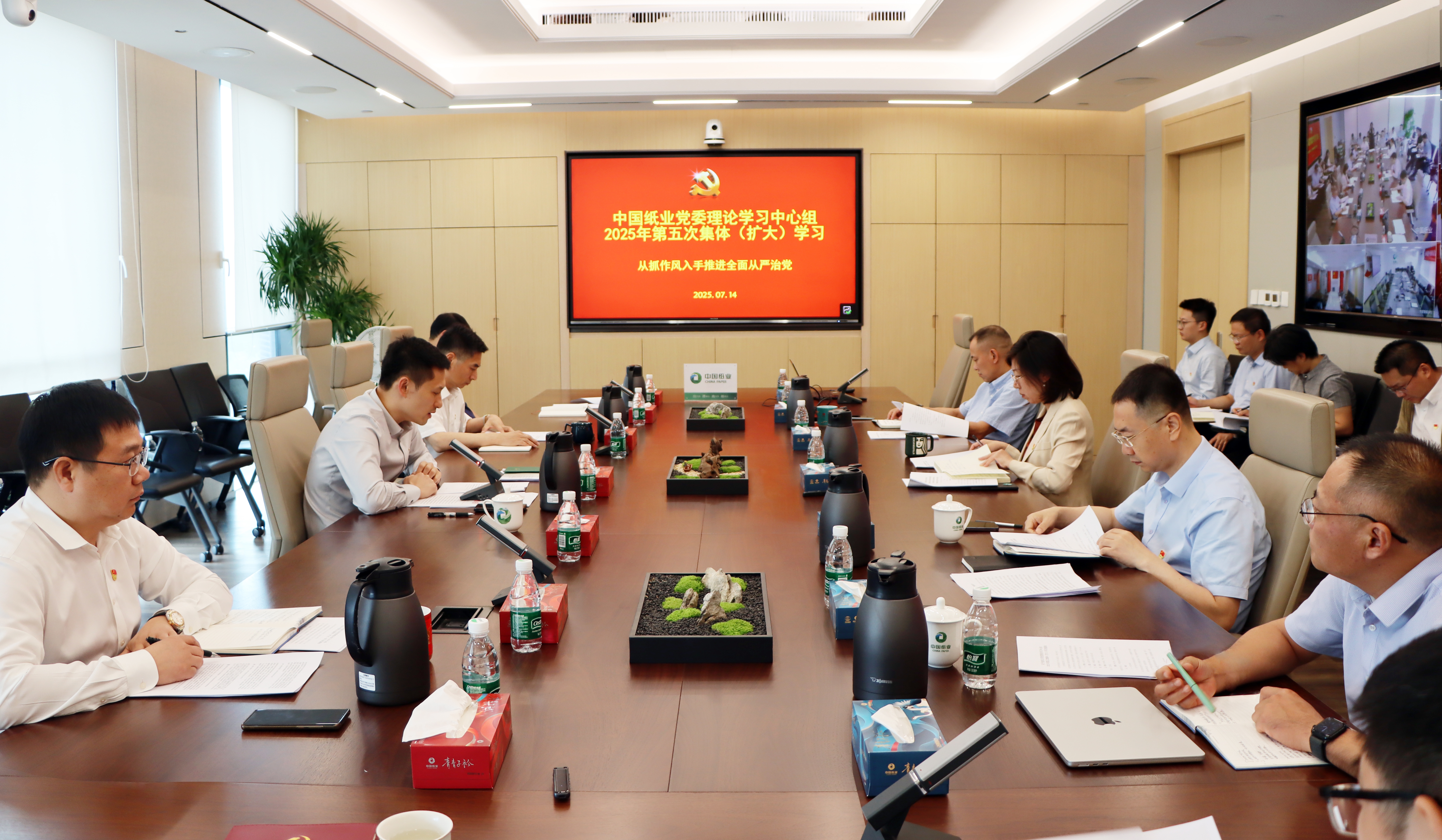 为持续跟进学习习近平总书记关于关于党的自我革命的重要讲话精神,扎实开展深入贯彻中央八项规定精神学习教育,2025年7月14日下午,中国纸业党委理论学习中心组以从抓作风入手推进全面从严治党为主题,开展2025年第五次集体(扩大)学习。公司党委书记钟天崎主持学习并讲话,公司党委委员,冠豪高新、泰格林纸党委书记聚焦学习主题,结合工作实际,依次交流学习体会。公司总助级领导、总部部门负责人,所出资企业党政纪负责人,年轻干部、新提拔干部和关键岗位干部列席会议。