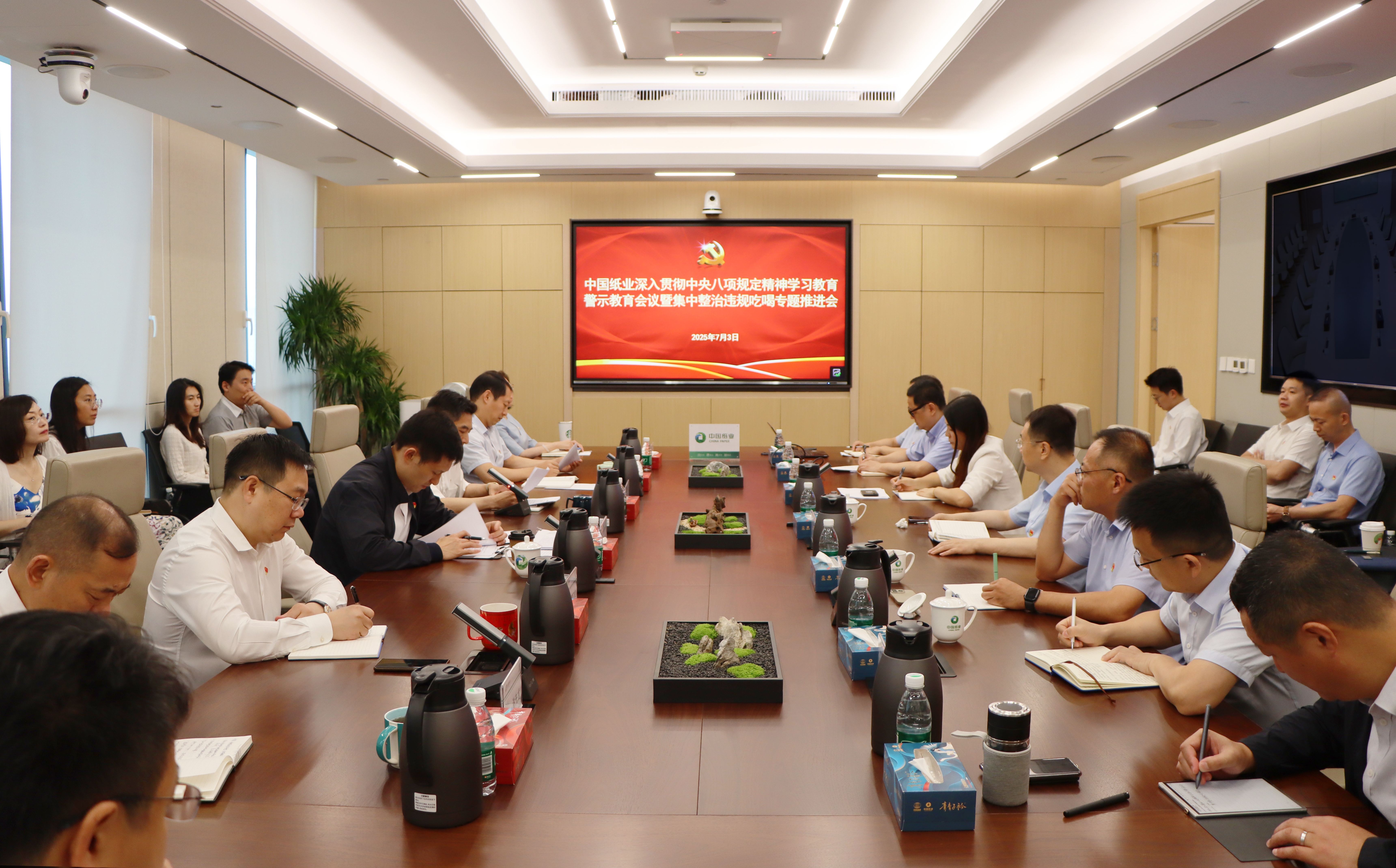 7月3日,中国纸业召开深入贯彻中央八项规定精神学习教育警示教育大会暨集中整治违规吃喝专题推进会,进一步严明纪律规矩,推动全面从严治党向纵深发展。中国纸业党委书记、董事长钟天崎就贯彻落实中央八项规定精神,深化作风建设作专题讲话。党委委员、纪委书记嵇正永通报系统内典型案例。党委副书记、总经理严肃主持会议。公司其他领导班子出席会议。
